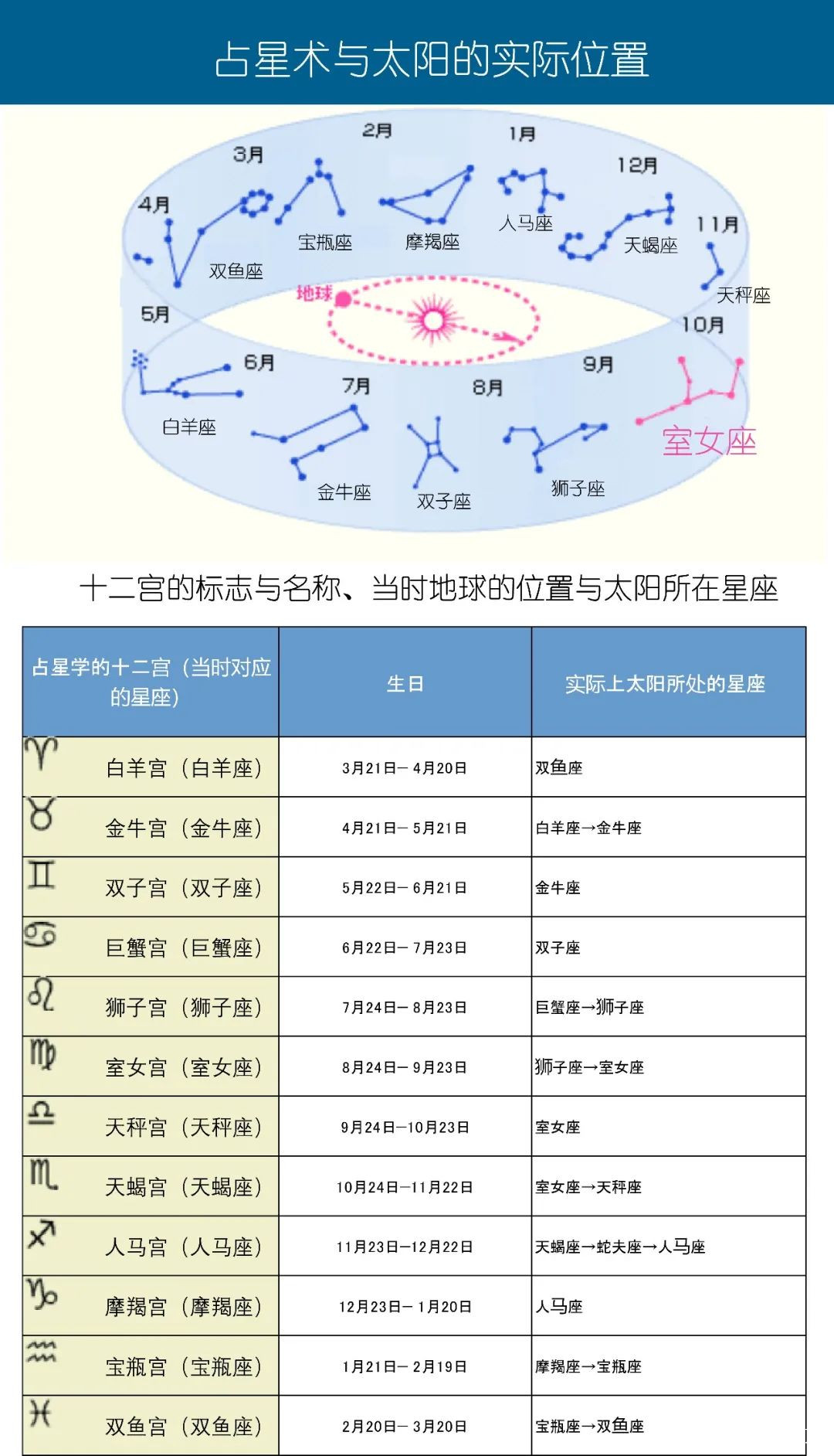 **太陽、月亮、系內行星(注1)與構成星座的恆星不同,它們會在星座間移動。所以占星術認為,一個人出生時,這些移動天體所處星座的性格會決定這個人的一生。特別是太陽,對人的生活影響最大,太陽星座決定着人們基本的運勢與性格。太陽在星座間移動的軌跡被稱為黃道。**位於黃道上的12個星座為黃道12星座。實際上,天文學上黃道共穿過13個星座(注2),且星座有大有小,太陽所處其中的時間也有所不同,但占星術將這些星座稱為“宮”,並將一年12等分,即“黃道十二宮”。
