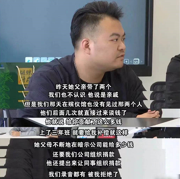 媽媽旁邊坐着父親和舅舅、叔父、姑父,幾位親屬不時説話,認為是因為公司給的壓力太大,才導致了洛洛的死亡,期間洛洛的父親更是幾次拍桌。