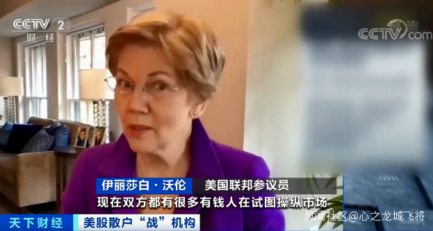 美國聯邦參議員 伊麗莎白·沃倫:現在雙方都有很多有錢人在試圖操縱市場,突然間,億萬富翁和一些對沖基金開始喊叫,僅僅是因為他們不是唯一通過操縱市場獲利的人,這就是為什麼我們要有證券交易委員會,來制定關於市場操縱的清晰規則,並且有骨氣能夠執行這些規則。