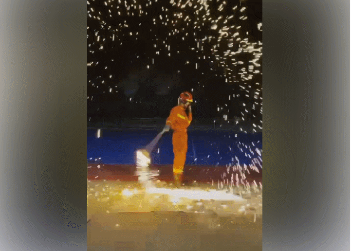 實驗中,消防員進行煙花舞動,並在煙花下分別放置報紙、衣服、豬皮和手套來模擬可燃物和人的皮膚。隨着不斷揮動鋼絲棉,迸發出的火星迅速點燃周圍的報紙。熄滅後發現,位於操作位上的衣物也被火星燒穿,豬皮則被高温燙傷。
