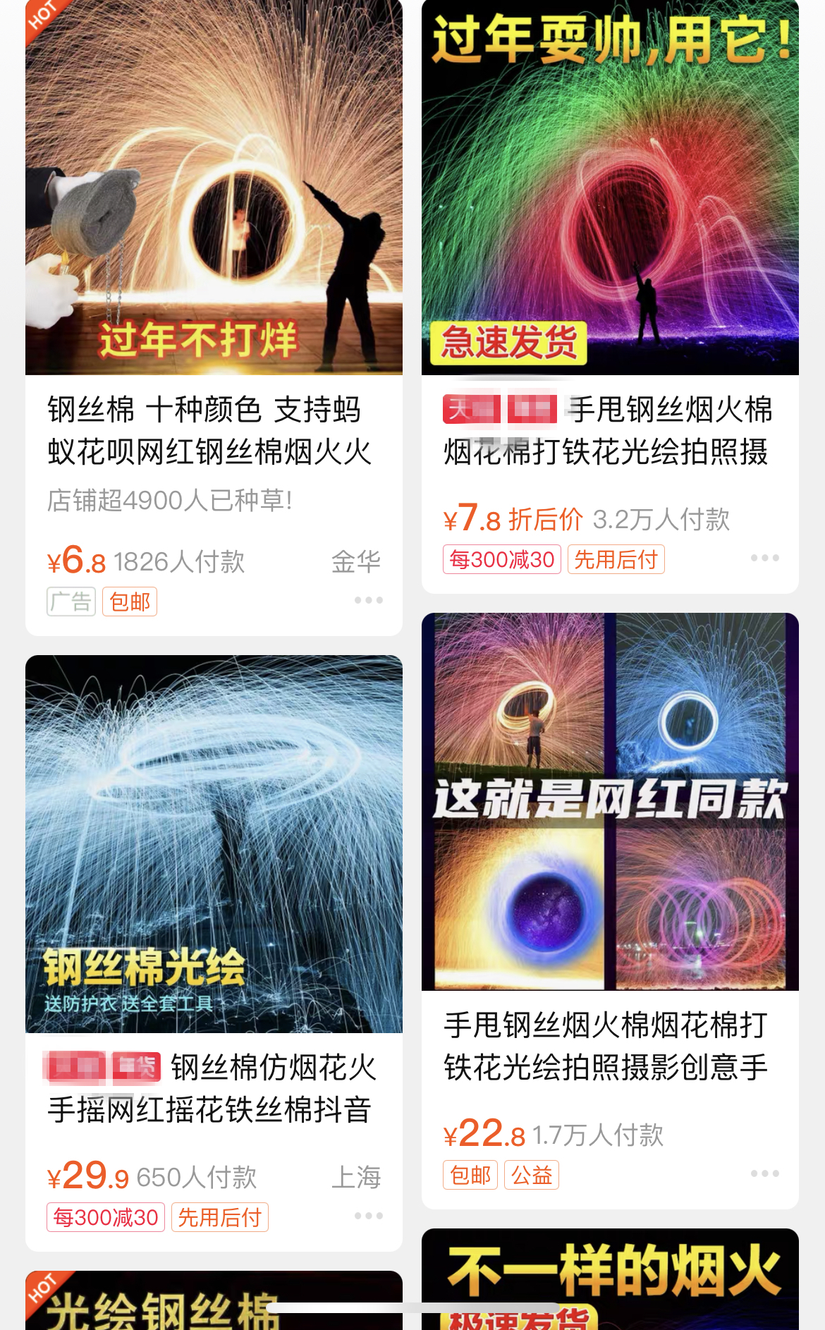 29日,在某電商平台搜索“鋼絲棉煙花”“網紅煙花”等關鍵詞發現,單家店鋪月銷量高達數萬件的不在少數,一些店家的宣傳封面還打上了“過年耍帥,用它”的字樣。