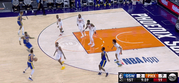 第一記是保羅外線假裝打格林,吸引庫裏到中路堵他的突破路線,然後傳給被庫裏放空的卡梅隆-約翰遜命中;