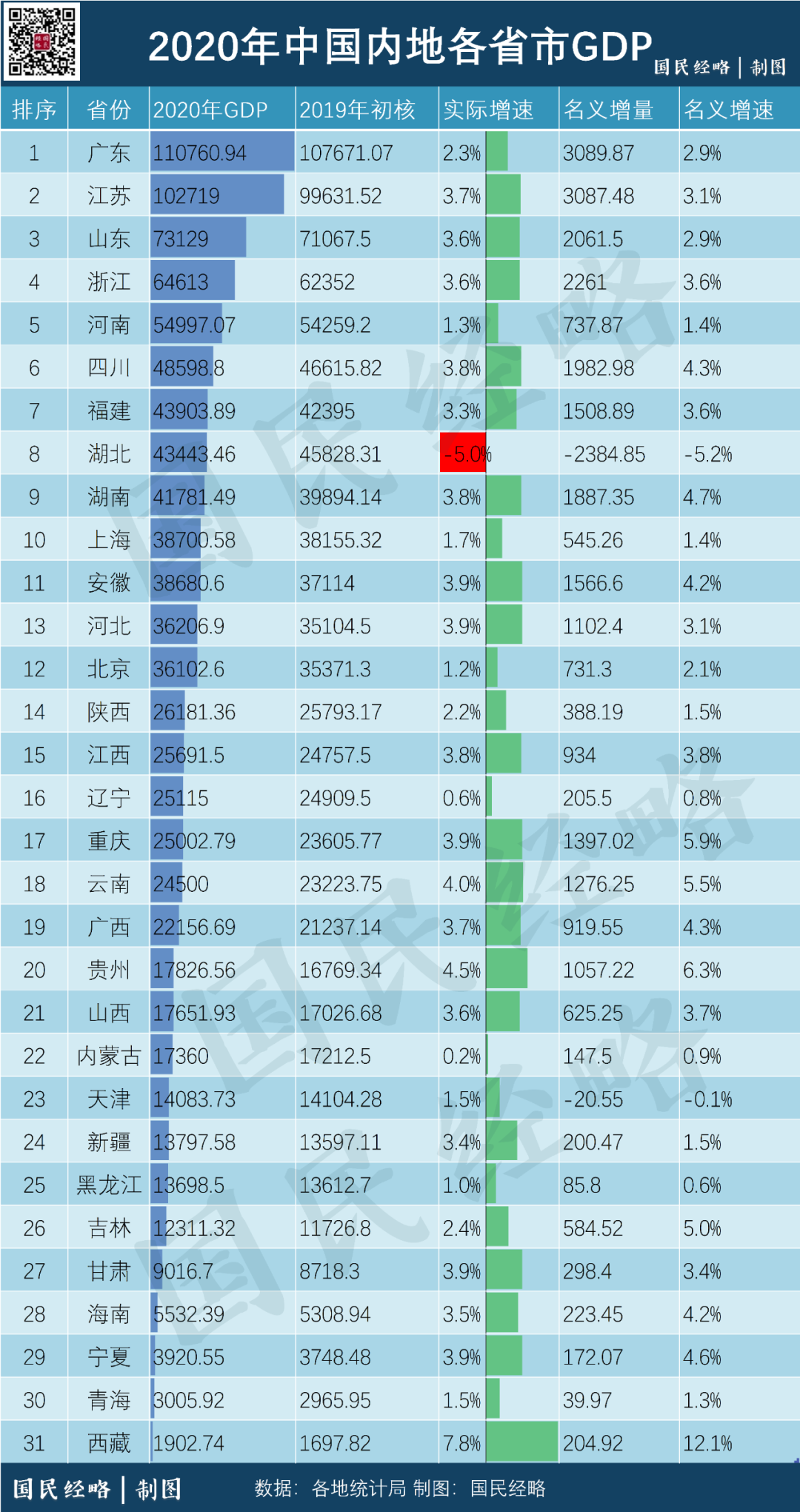 2020年,疫情衝擊之下,中國經濟逆勢轉正,成為唯一正增長的主要經濟體。由於疫情衝擊不一,各省市經濟發展情況不一,省域經濟發生了巨大變化。