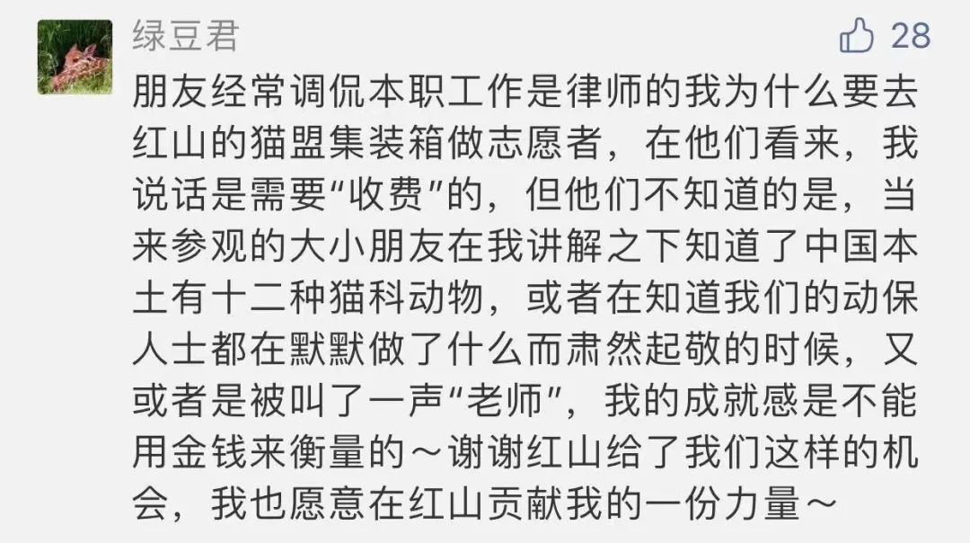 很多人不理解,但我相信,到過貓盟紅山基地的人,聽過志願者講解的人,會理解,也會進一步瞭解這些動物,而不是隻是看過了它們。