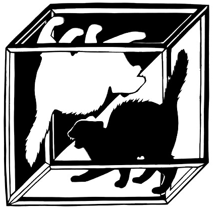 他説,想象一下,我們把一隻貓密封在一個裝有少量放射性物質的盒子裏,還裝有一小瓶毒藥和一個一旦探測到放射性衰變就會釋放毒藥的機構。