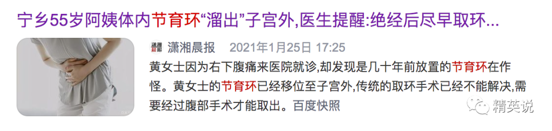 一些女性戴了二十多年的節育環,卻根本沒人告訴她這個東西一定要取出,也從未意識到身體的一些不適症狀與節育環有關。直到絕經後發現婦科病、子宮萎縮、宮頸病變、宮頸癌等嚴重婦科疾病,才去醫院就醫。