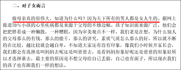 值得一提的是,在這一章節中,也出現了“做母親很偉大,因為天下所有男人都是女人生的”這樣的內容。
