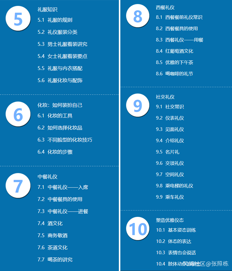 而該課課程目錄也確實如其介紹所説,包括女士個人風格定位、男士女士服裝搭配、化妝技巧、中西餐禮儀和社交禮儀等內容。