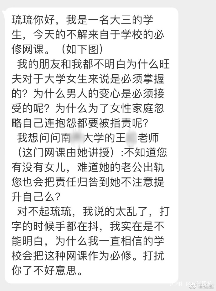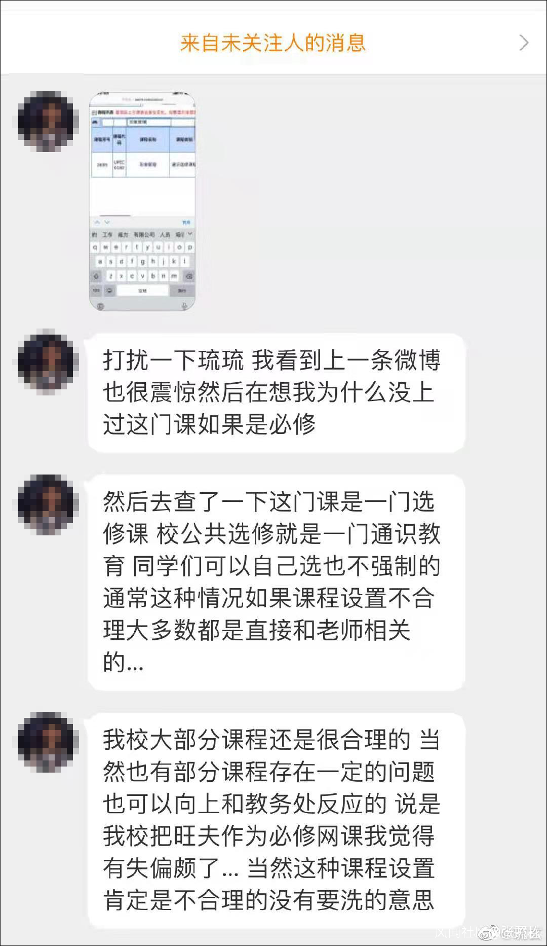 1月29日,微博博主@琉玄 微博爆料,有網友向其投稿,稱自己就讀的大學出現了“女人要旺夫”的必修網課。
