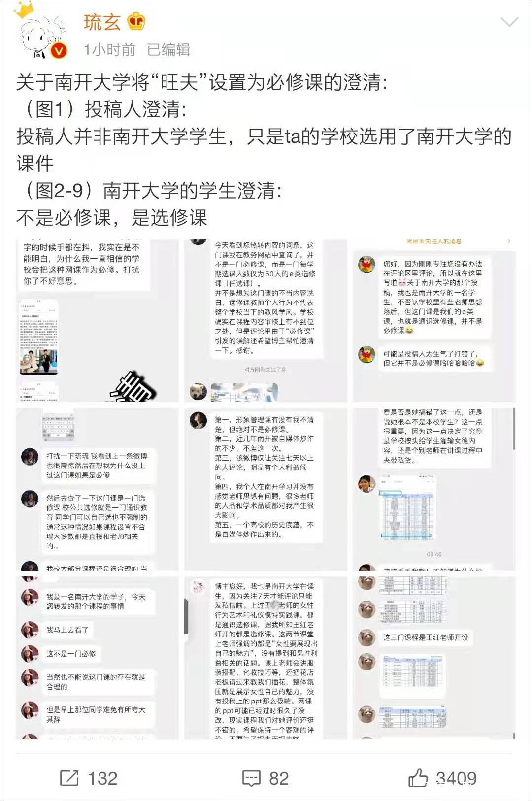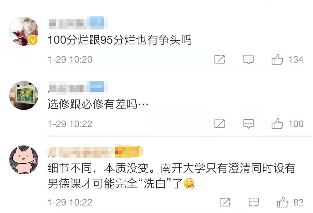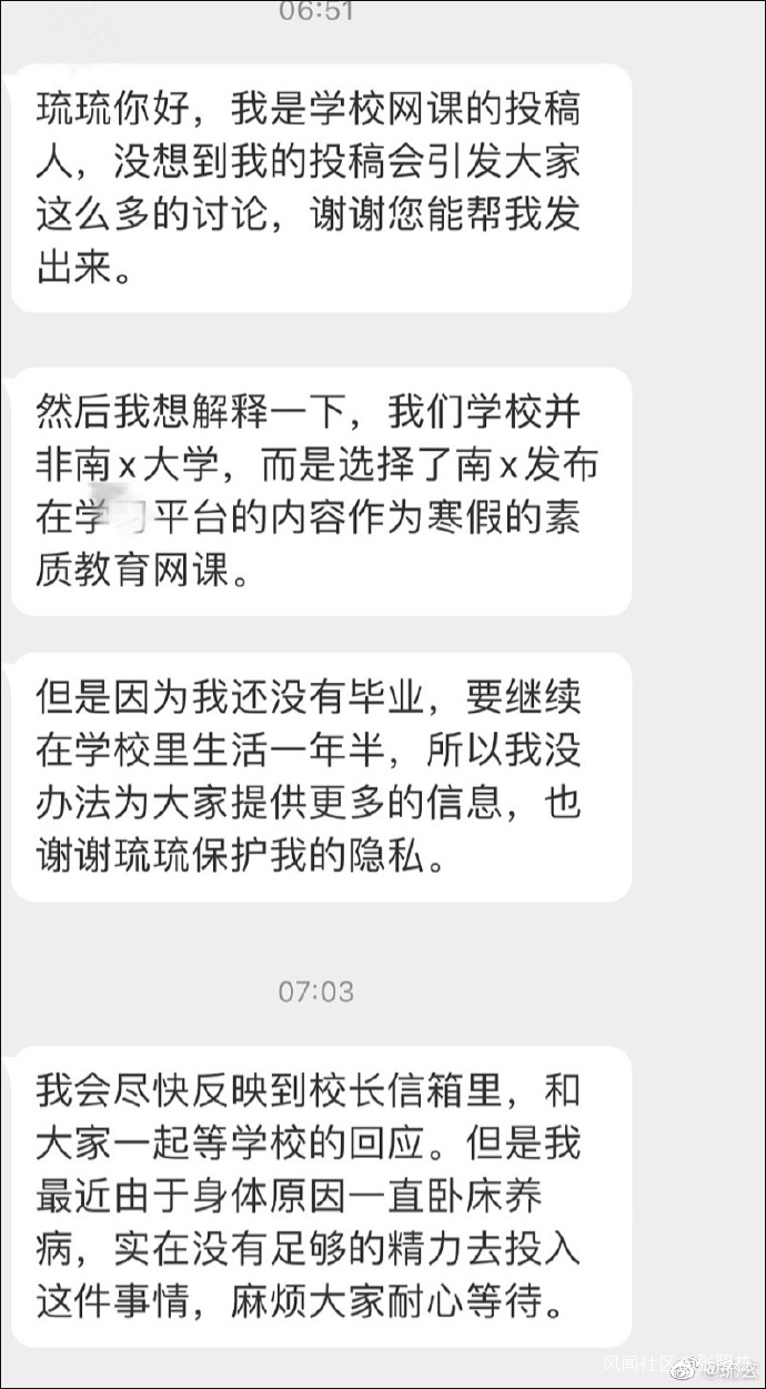 事情引發關注後,29日上午10:18,該博主@琉玄 發博澄清:爆料人並非南開大學學生,而是其學校選修了南開大學的課件;很多南開大學學生私信表示,該課程是選修課,不是必修課。