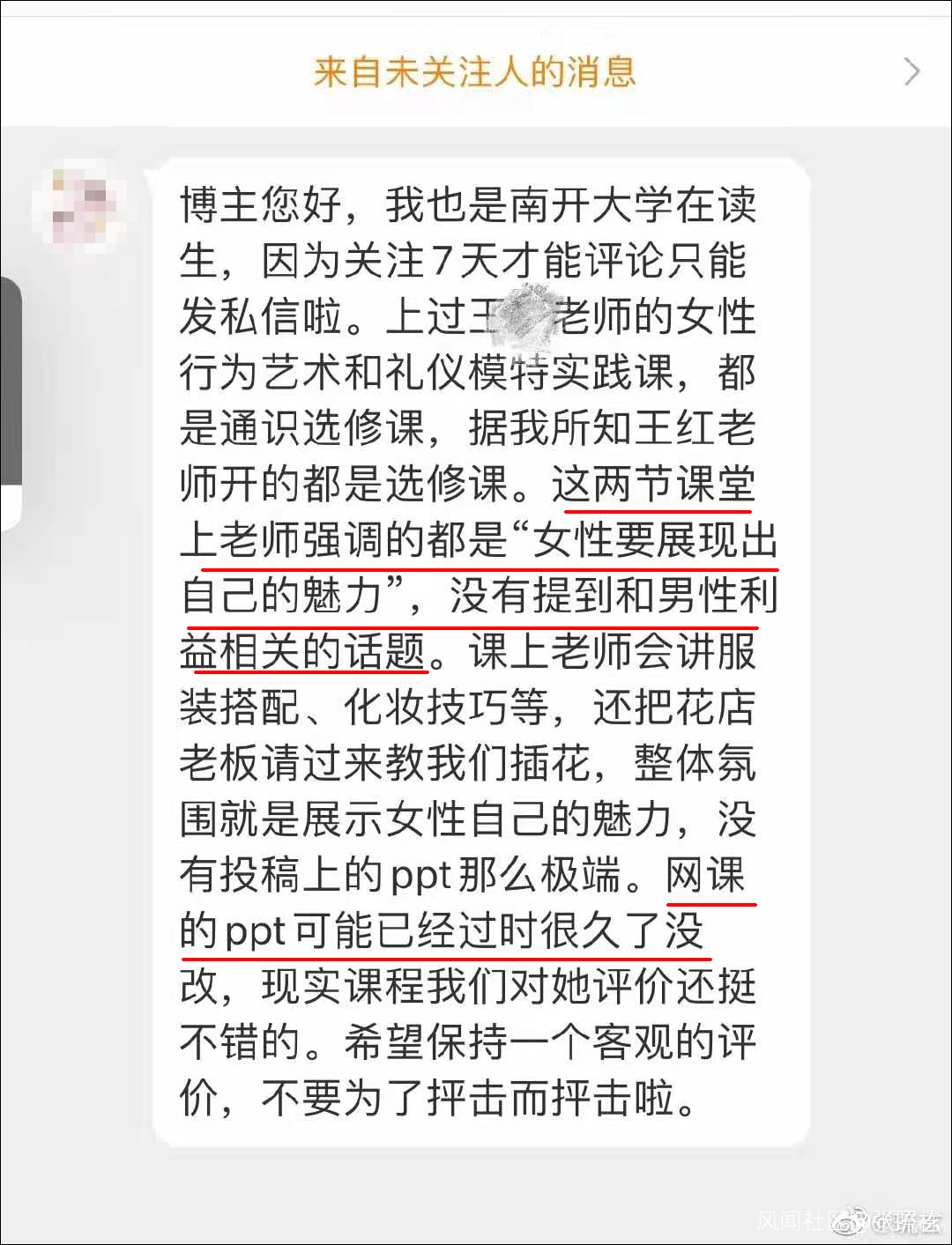 此外,在@琉玄 發佈的南開大學學生的私信截圖中,很多學生力挺這門課,稱老師強調的是“女性要展現出自己的魅力”,“網課的PPT已經過時很久了。”