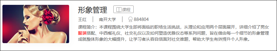 該課課程介紹為:“圍繞大學生即將面臨的職場生活挑戰,從理論和應用兩個層面展開,詳細介紹了男女服裝搭配、中西餐禮儀、社交禮儀以及如何塑造優雅儀態等系列問題。旨在藉由每一個細節的形象管理成就整體形象的大幅提升,讓學習者從容自信面對社交難題,幫助大學生有效提升個人形象。”