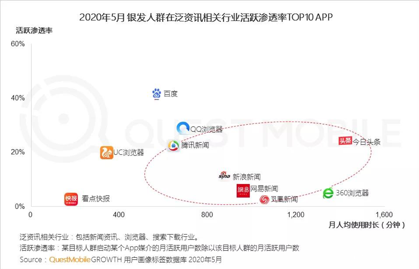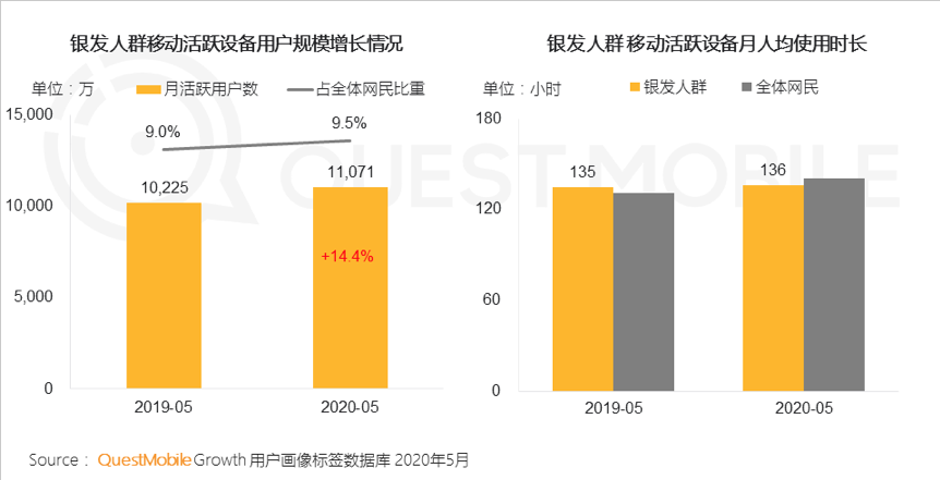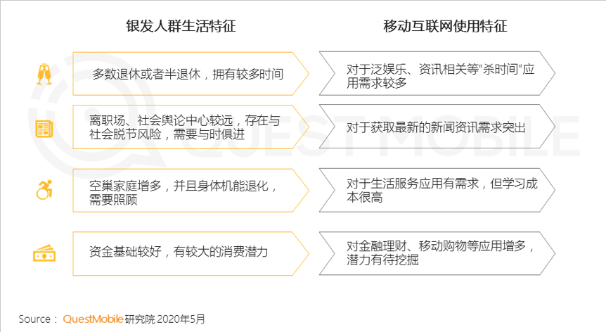 QuestMobile數據也顯示,進入人生的下半場,由於時間較為充裕,銀髮人羣對於娛樂、資訊類、生活服務類需求突出。