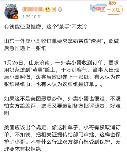 據封面新聞此前報道,1月26日,網曝山東濟南一外賣小哥接到一份奇葩奶茶訂單,訂單備註要求騎手“送到了不用對他客氣,摔那渣男臉上就行”。