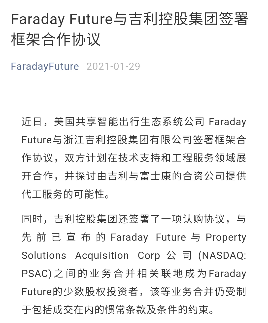 1月29日,賈躍亭創辦電動汽車公司法拉第未來(FaradayFuture,下稱“FF”)官方公眾號發佈消息稱,與浙江吉利控股集團有限公司於近日簽署框架合作協議,雙方計劃在技術支持和工程服務領域展開合作,並探討由吉利與富士康的合資公司提供代工服務的可能性。