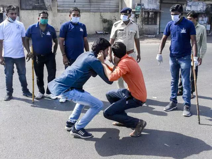 在新冠疫情的攻勢之下,莫迪政府於三月底宣佈印度全國封鎖,而大量的警察隨之走上街頭設防糾察。在街頭上被警察揪着做運動的精神小夥們,大多是因為沒有戴口罩或是出門閒逛而被抓到。