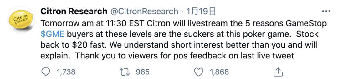 一個星期前,香櫞還在發聲,説GME的股價很快會跌到20美元,嘲諷散户們是“在這局撲克遊戲裏的輸家”。
