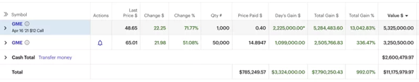 但當他們真的推動股價上漲,開始逼空後,有人曬出了自己掙了幾十萬、幾百萬美元的賬户餘額。其中一個帶頭人DFV目前已經掙了1117萬美元。