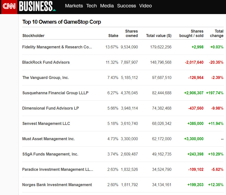 至於所謂廢柴血洗華爾街的資本家,不過是一個假象,查一下游戲驛站現在的股東們就會發現,幾乎一色都是全球頂級的大基金。