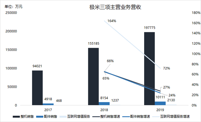 營收結構方面,招股書顯示,極米科技基本是靠智能投影產品的整機銷售來支撐。其中2017到2019年,整機銷售的營收佔比每年都超過94%。