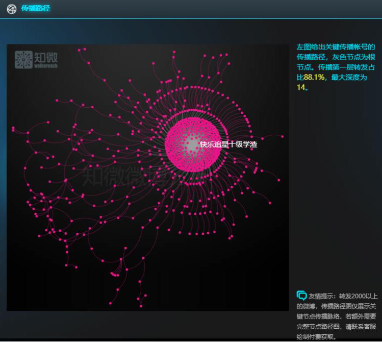這條微博的發佈時間與《合成大西瓜》上線時間一致,且獲得一萬多轉發。知微傳播路徑分析顯示,@快樂追星十級學渣 是傳播路徑的根節點,最大傳播深度為14。