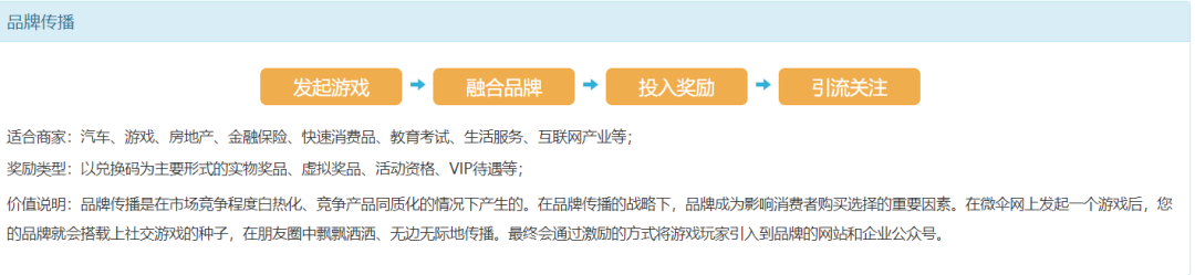 微傘遊戲旗下所有小遊戲,均可創建推廣活動。品牌可在遊戲開始前添加一個活動宣傳頁;或在遊戲中投放獎勵,粉絲取得一定成績就可參加“試試手氣”的抽獎活動;在贏得獎勵後引導玩家關注微信公眾號或移動網站頁面;同時部分遊戲還支持在遊戲頁面中植入品牌信息。