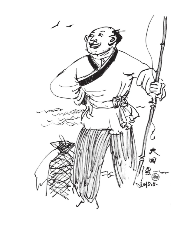 大回是能人,專攻垂釣。手裏一根竹竿子,就是釣魚竿;一個使針敲成的鈎,就是魚鈎;一根納鞋底子用的上了蠟的細線繩,就是魚線;還有一片鴿子的羽毛拴在線繩上,就是魚漂。只憑這幾樣再普通不過的東西,他蹲在坑邊,頂多七天,能把坑裏幾千條魚釣光了,連魚秧子也逃不掉。