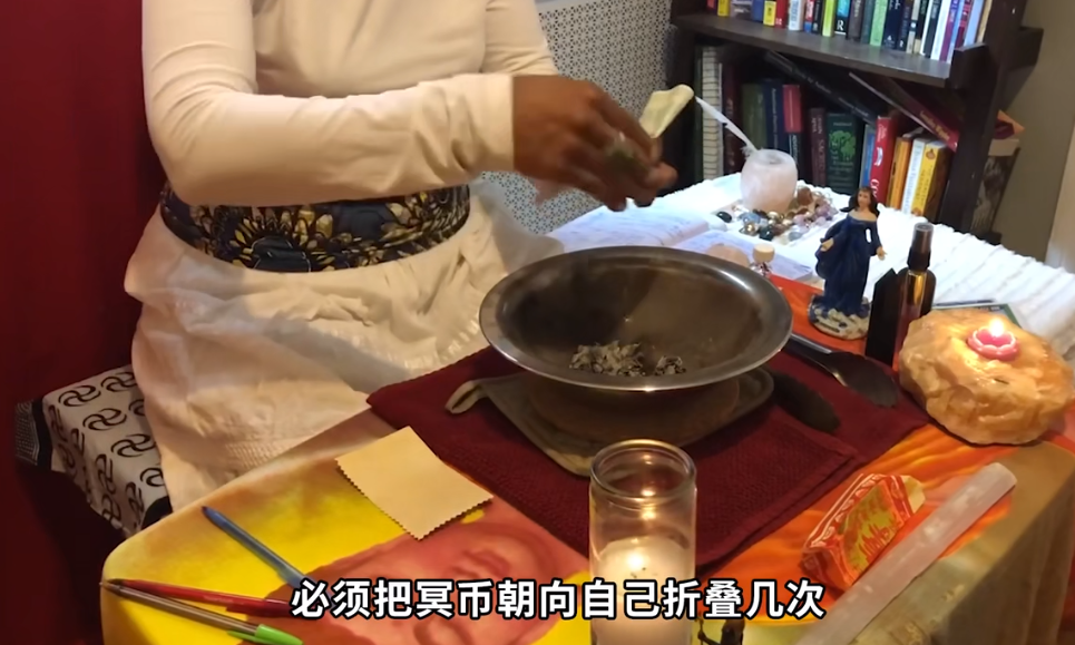 想要燒冥幣,首先你得有個祭壇,外國網友在一張四四方方的小桌子上,就搞了一套具有西方特色的陣法。