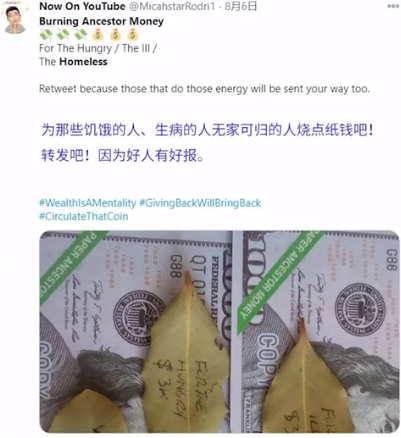 在國外,冥幣的作用不只是祈求保佑,也可以拿來作為愛的貢獻,有位外國網友就發了一條動態,號召大家一起燒冥幣: