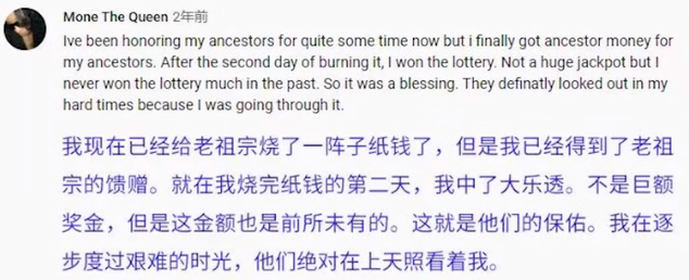 油管上一位冥幣學家的經歷更加離奇,他坐在自家客廳,拿着一大張冥幣絮絮叨叨地説着,他每天都會給祖先燒錢,希望能得到祖先保佑。