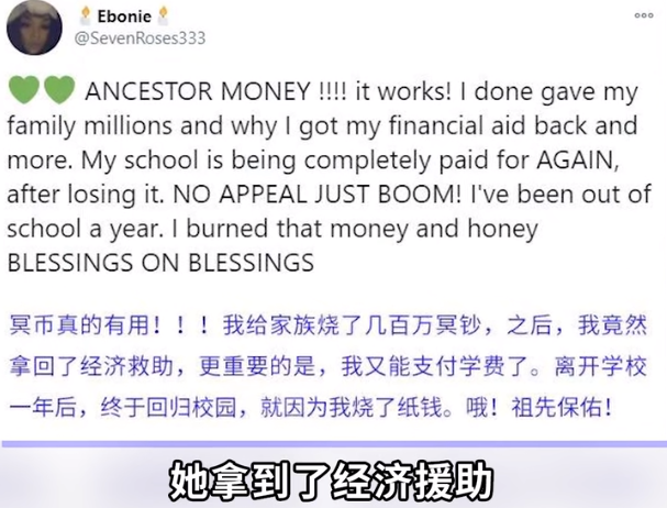 就在她給家族燒了幾百萬冥幣之後,她神奇了地拿到了經濟救助,一切都是因為這些冥幣,她在休學一年以後終於重返校園了,祖先保佑!