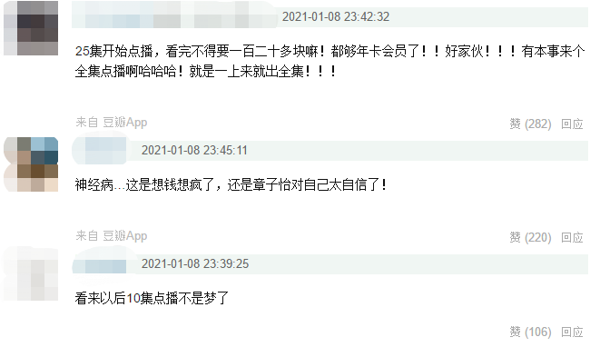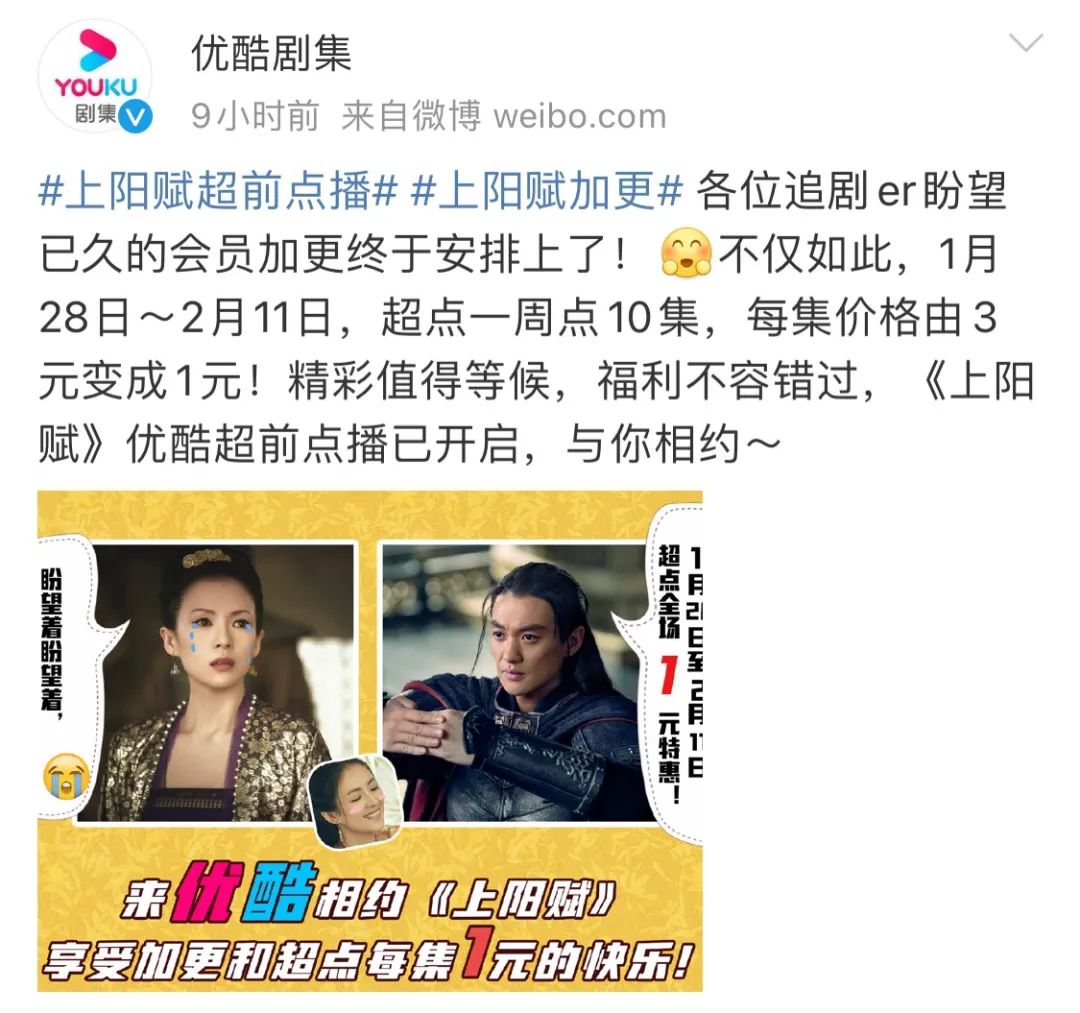 1月21日,68集的《上陽賦》剛剛播到第25集,優酷開始按照,單價三塊錢,收超前點播的錢了。