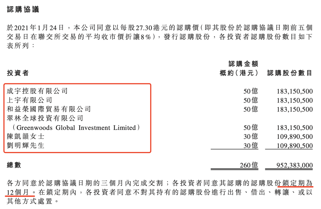 這6名投資者是成宇控股、上宇有限公司、和益榮國際貿易有限公司、翠林全球投資有限公司、陳凱韻、劉明輝,並且均同意股份鎖定12個月。