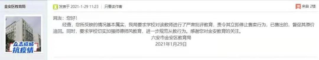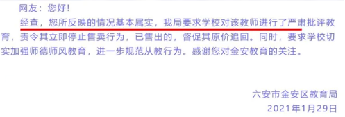 據安徽商報30日報道,1月29日,六安市金安區教育局回應稱,網友所反映的情況基本屬實,該局要求學校對該教師進行了嚴肅批評教育,責令其立即停止售賣行為,已售出的,督促其原價追回。同時,要求學校切實加強師德師風教育,進一步規範從教行為。