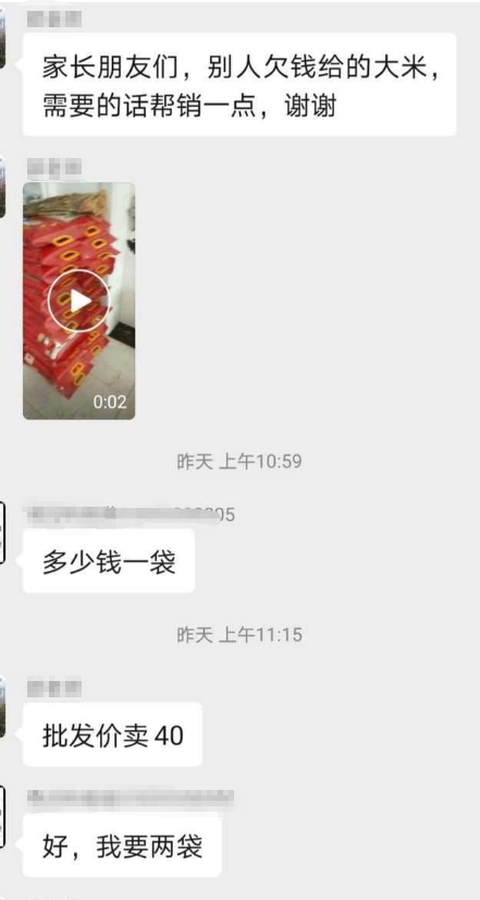 消息一發出,就有家長在羣裏響應老師,稱要購買。大米批發價是40元一袋。