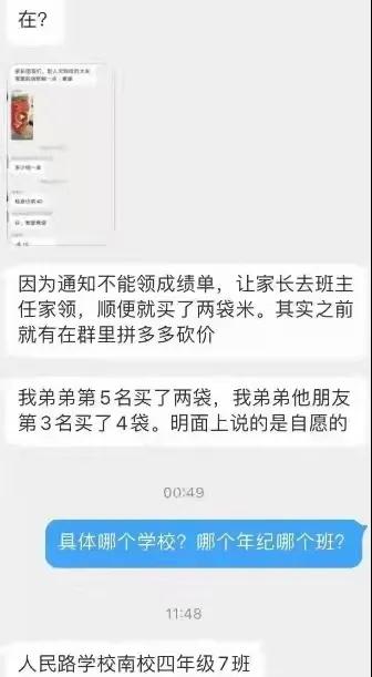 網友稱,不少家長去班主任家領成績單時都順便買了兩袋米,成績第5名的學生,其家長買了兩袋,第3名的家長買了4袋。“明面上説是自願的”,但家長都不好意思不買。