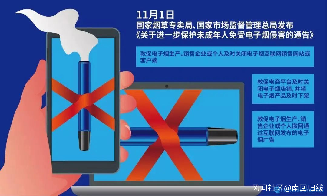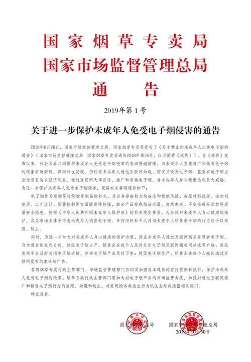 2019年11月,國家煙草專賣局和國家市場監督管理總局聯合發佈了《關於進一步保護未成年人免受電子煙侵害的通告》,要求各類市場主體不得向未成年人銷售電子煙。