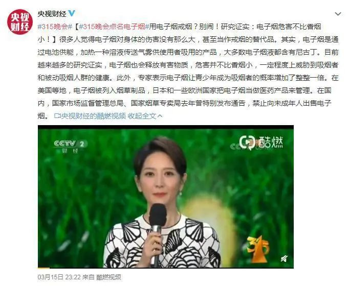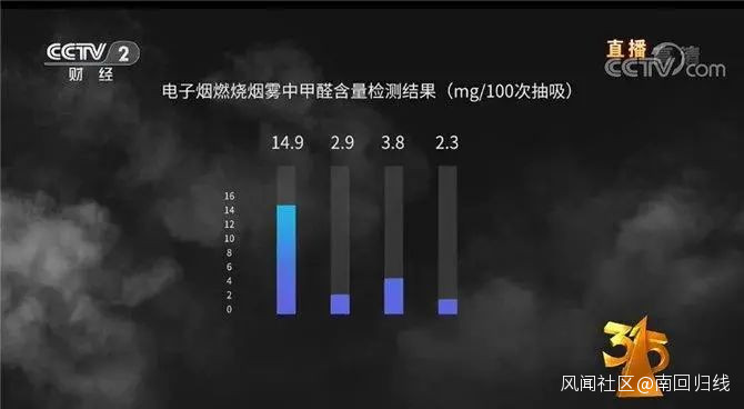 2019年,315晚會指出:“與傳統香煙一樣,電子煙所使用的煙液含有尼古丁,長期吸食同樣會成癮,並且通過檢測發現,電子煙煙霧中甲醛濃度是居室內空氣中甲醛最高濃度的數十倍甚至上百倍,煙霧中還檢測出大量丙二醇和甘油,在加熱情況下轉化成成氣體的兩種物質會對人體呼吸道有強烈的刺激作用。”