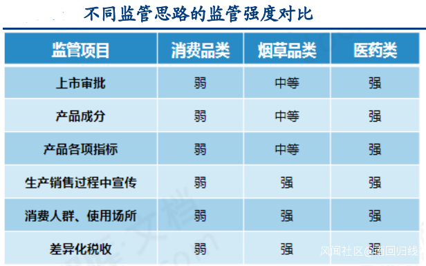 區別在哪呢?按醫藥產品管理,標準嚴苛,許可證都很難申請下來;按煙草產品管理,税率極高,導致零售價格很高,在很大程度上影響銷量。