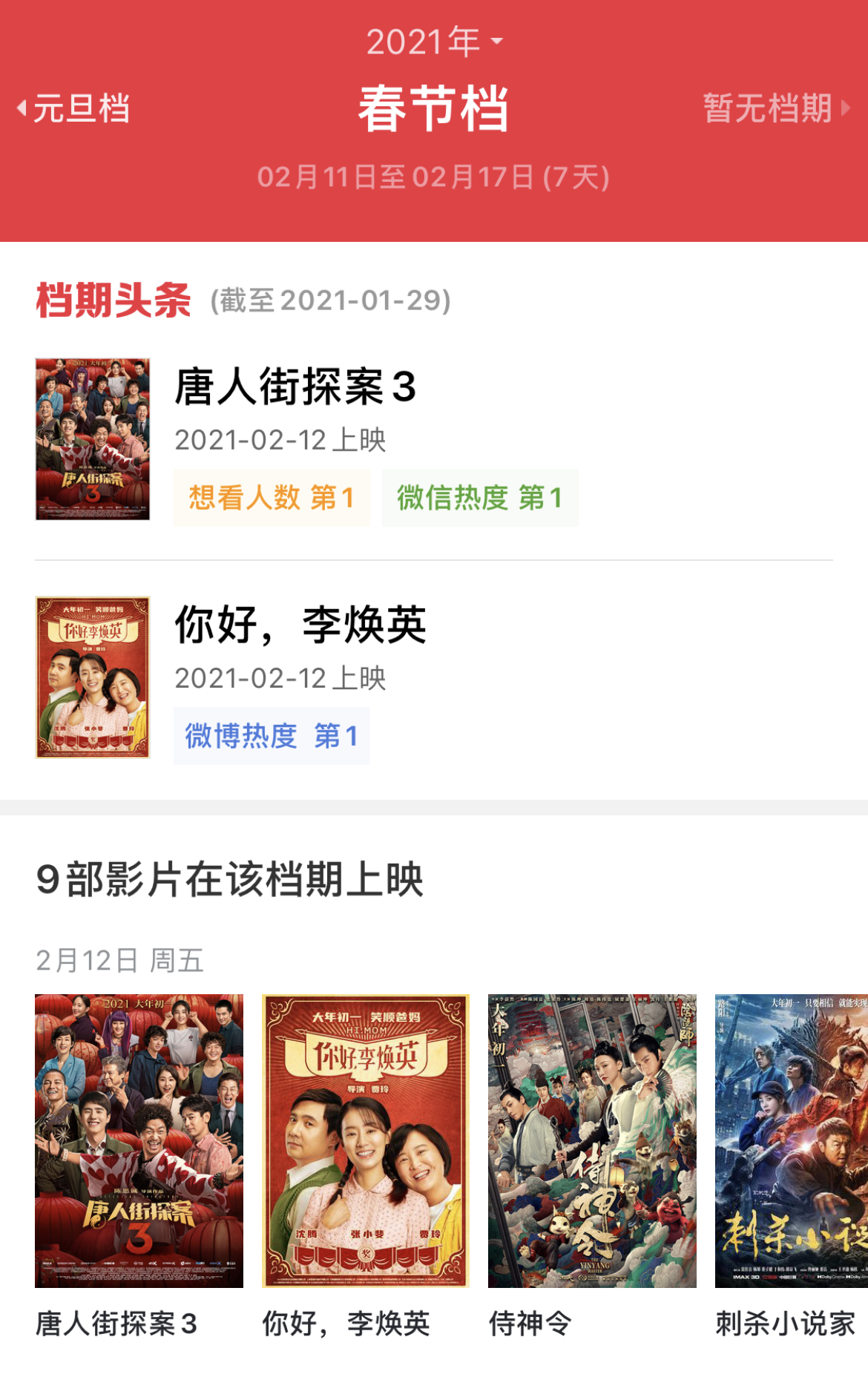 其實,春節檔共有九部電影上映,但《不要先生與好的女士》《夢醒黃金城》兩部情人節後上映的影片還未開啓預售,因此本次預售榜只包含七部大年初一上映的影片。