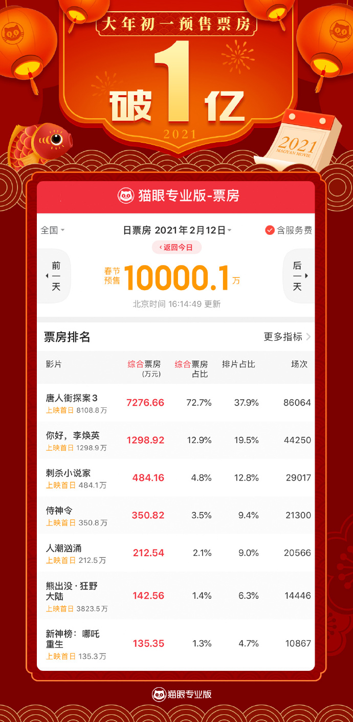 春節檔預售票房破億,《唐人街探案3》超七千萬強勢領跑_風聞