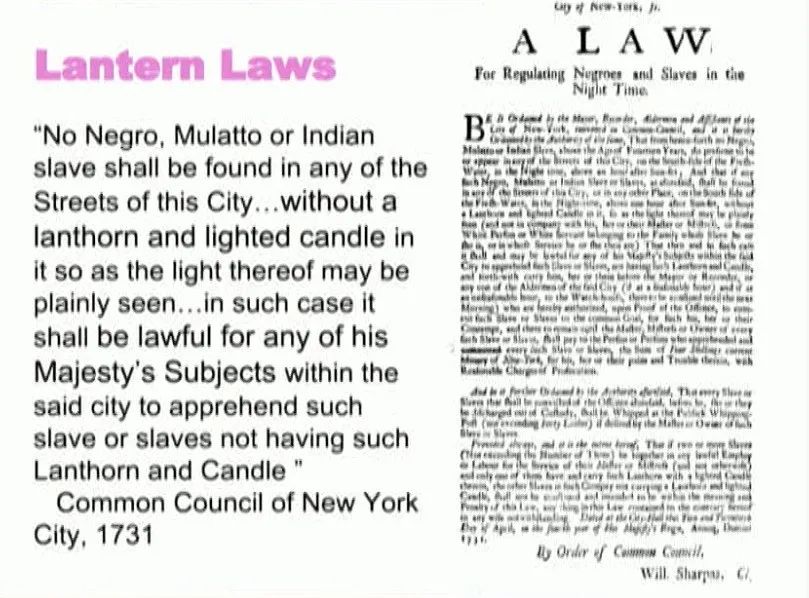 燈籠法規定,日落之後,黑人、混血兒和土著奴隸要想在城市裏走動,如果身邊沒有白人,就必須攜帶一個蠟燭燈籠。如果不這樣做,一經發現,就會被抓進監獄,直到“主人”來認領,而在等待期間,他們可能會經歷毆打等各種遭遇。
