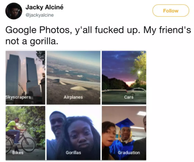 黑人小哥 Jacky Alciné 閒來無事,把一些照片上傳到了谷歌相冊,沒想到,Google 的圖像識別算法在對照片進行分類的時候,竟然把他的黑人朋友認成了大猩猩。