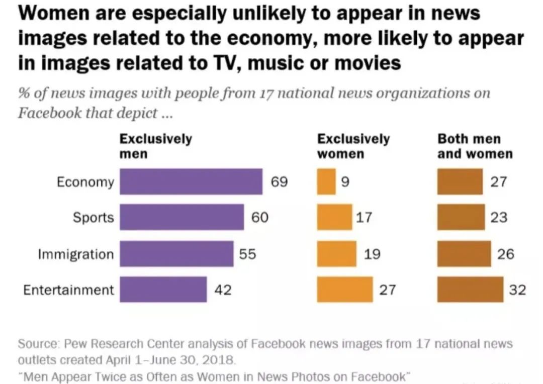 在美國,有超過 40% 的成年公民,主要通過 Facebook 來看新聞,有媒體對新聞配圖按性別進行了統計,驚訝的發現,不管是經濟還是娛樂版塊,女性的出場率都遠遠低於男性,哪怕都是單人新聞圖片,女性形象在圖片中的佔比,也處於劣勢。