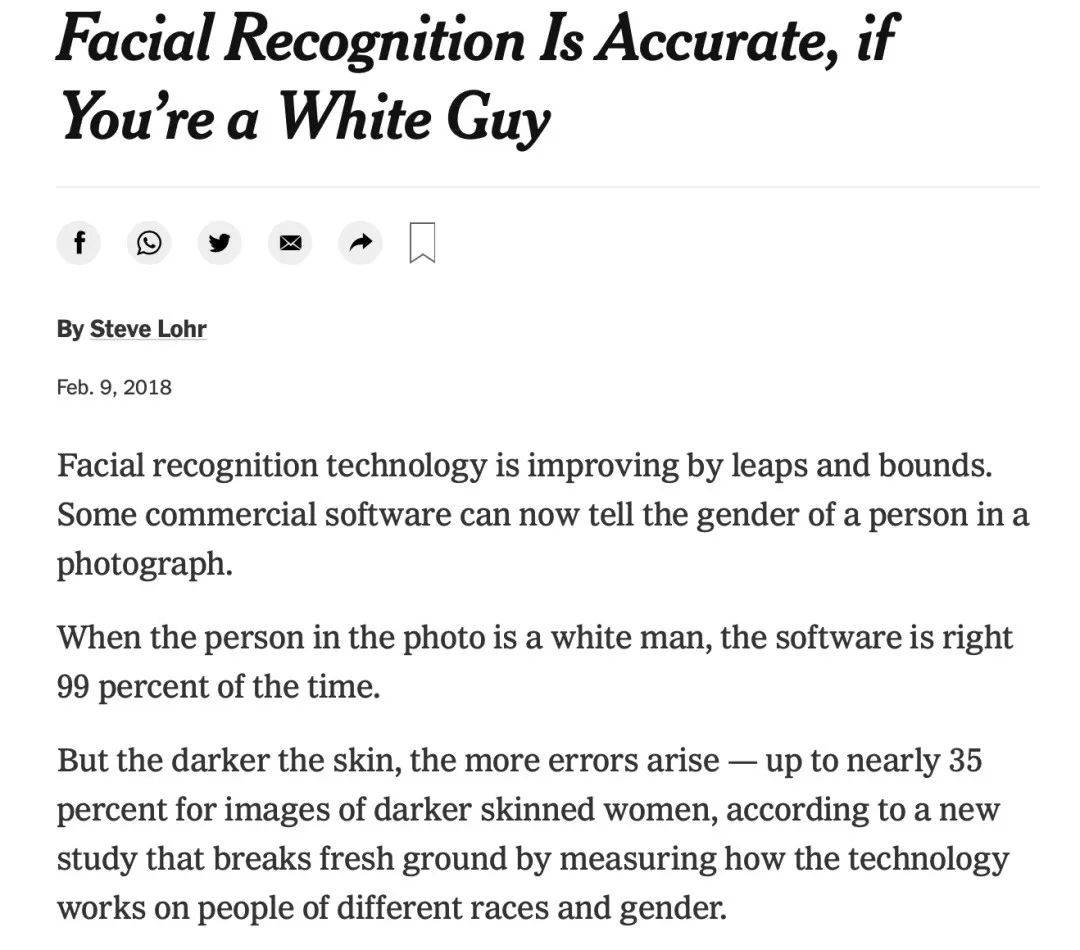 2018 年,美國《紐約時報》發表過一篇文章,引用美國麻省理工學院的最新研究論文,證實在不同種族面前,人臉識別的準確率存在巨大差異。