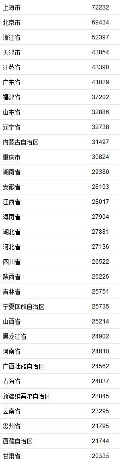 排名第二的是北京,其居民人均可支配收入距離7萬元大關一步之遙,達到了69434元。排在第三名的是浙江,浙江2020年居民人均可支配收入達到52397元。