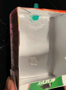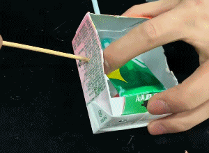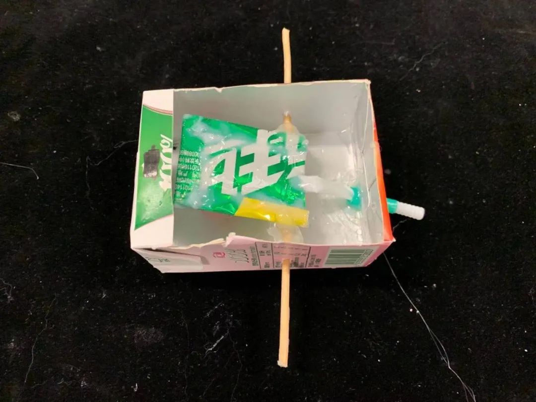 盒子下面的吸管中充滿了水,而密封的鋁箔包當中含有一定的空氣。當蠟燭加熱的時候,鋁箔當中的空氣膨脹,將吸管中的水擠出,並沿着吸管排出,大家就可以看到吸管裏冒出了泡泡。
