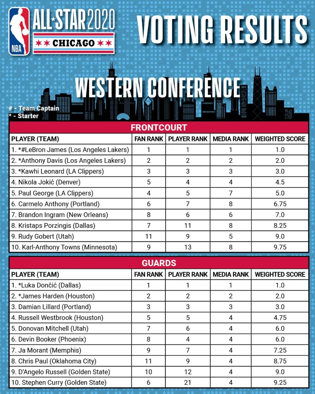 比如去年在西部選後衞時,庫裏因為有傷,全明星投票前只打了開始的4場比賽,球員直接把他排在第21位,而媒體把他列第四,球迷票數列第六。分子這麼大,庫裏不可能得高分,直接被排到後衞第10。