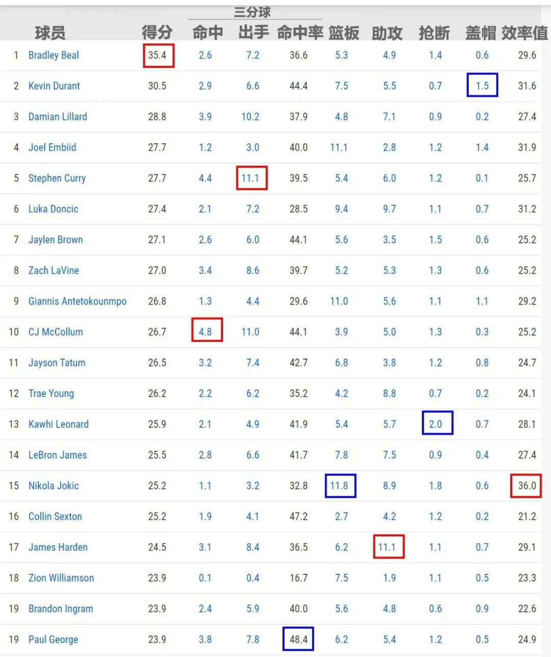 杜蘭特復出前一直帶着巨大的問號,可是1/4賽季打完,徹底征服了所有人。他不僅場均得分達到30+,而且效率值在東部明星中與恩比德只差0.3。他極有可能在球迷、球員和媒體三項投票中都列在首位。