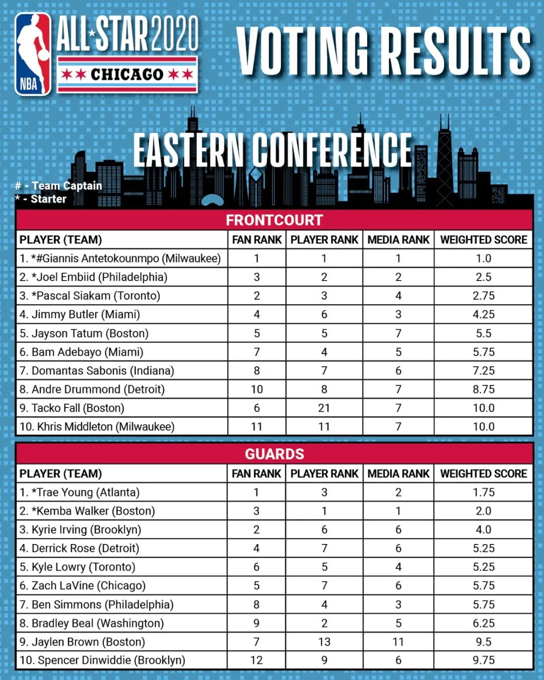肯巴·沃克雖然在球迷投票中只列後衞第三,但球員和媒體都把他列在第一位,用同樣方法計算後結果為2.0,於是沃克當上了首發。